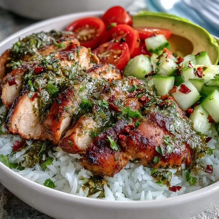 Save to Pinterest My neighbor knocked on the door one afternoon with a bunch of fresh cilantro and parsley overflowing from her market bag, insisting I do something with them before they wilted. That's when I discovered chimichurri chicken bowls, a dish that turned a simple weeknight dinner into something so vibrant and alive that my whole family asked for seconds. The magic wasn't in any single ingredient but in how that herbaceous sauce brought everything together, making even plain rice feel like an event.