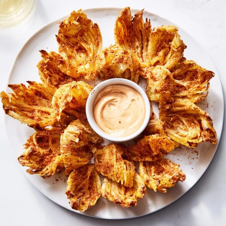 Save to Pinterest My sister called them "onion flowers" the first time I brought them to a game night, and somehow the name stuck. I'd been experimenting with fried appetizers that weekend, half-inspired by a restaurant we'd visited and half just messing around with what was in my pantry. When those golden petals hit the oil and started blooming outward, I knew I'd stumbled onto something special—the kind of dish that makes people stop mid-conversation to ask what they're eating.